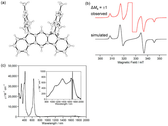(a) ORTEP drawing of 4b. Displacement ellipsoids are drawn at the 50% probability level. (b) ESR spectra of 4b at 470 K. (c) UV-Vis-NIR spectra of 4b in THF. Reprinted with permission from Ref. [45], Wiley-VCH, 2019.
