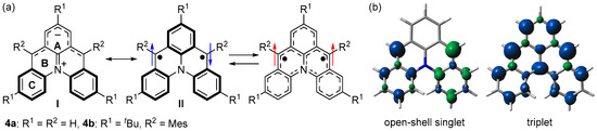 We designed azoniadibenzo[a,j]phenalenide (4a), in which m-quinodimethane is bridged by diphenylamine (Figure 4a) [45]. DFT calculations predicted that 4a has a singlet ground state with an open-shell singlet diradical character of 0.57 (LC-UBLYP/6-311G(d,p)//UB3LYP/6-311G(d,p)) and ΔEST of −24.0 kJ mol−1 (UB3LYP/6-311G(d,p)). The spin density distribution was predicted to be similar to that of 3a; spins delocalize over two benzyl radicals in the singlet state and m-quinodimethane moiety in the triplet state (Figure 4b).