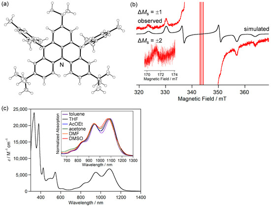5b+·TfO− was stable in a glove box under argon atmosphere in the solid state and even in solution under air. Single crystals of 5b+·TfO− obtained by recrystallization from a dichloromethane–hexane solution in a degassed sealed tube had an almost D3h symmetric main core structure with similar lengths of C–C bonds to 1c (Figure 9a). ESR spectra of the benzene solution of 5b+·TfO− at room temperature showed a signal split by six α-protons and a nitrogen atom (Figure 9b). The experimental spin density of α-carbon atoms (0.300) agreed well with the calculated spin density (+0.281, Figure 8c) and that of 1c. 5b+·TfO−, which also showed a weak forbidden transition of ΔMs = ±2, and its triplet state was confirmed by the 2D-ESTN spectrum.