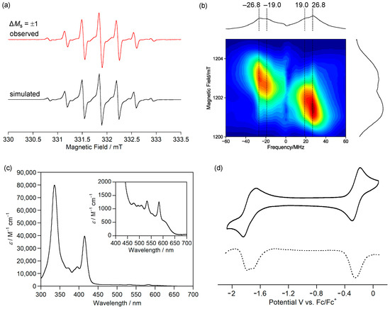 (a) X-band cw ESR spectra of 1c in toluene at room temperature (red, experiment; black, simulation). (b) Q-band pulse ESR-based two-dimensional electron spin transient nutation spectra of 1c in frozen toluene solution at 50 K. (c) UV-Vis absorption spectrum of 1c in CH2Cl2. (d) Cyclic voltammogram (solid line) and differential pulse voltammogram (dashed line) of 1c in CH2Cl2. Reprinted with permission from Ref. [56], American Chemical Society, 2021.