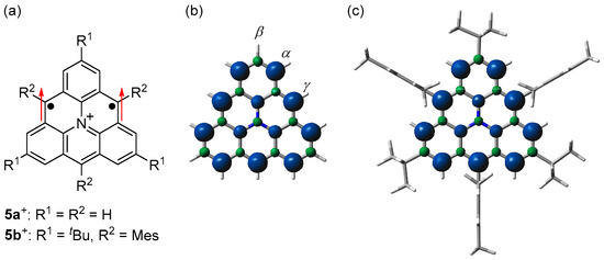 (a) Structures of 5+. Arrows indicate electron spin. Spin densities of triplet states of (b) 5a+ and (c) 5b+. Blue and green surfaces represent α and β spin densities, respectively. Reprinted with permission from Ref. [61], Wiley-VCH, 2023.
