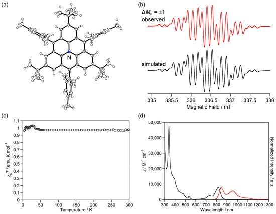 (a) ORTEP drawing of 5b+·TfO−. Displacement ellipsoids are drawn at the 50% probability level. TfO− is omitted for clarity. (b) ESR spectrum of 5b+·TfO− in benzene at room temperature. (c) χpT–T curves of 5b+·TfO−. (d) UV-Vis-NIR absorption (black) and fluorescence (red, excited at 730 nm) spectra of 5b+·TfO− in CH2Cl2. Reprinted with permission from Ref. [61], Wiley-VCH, 2023.