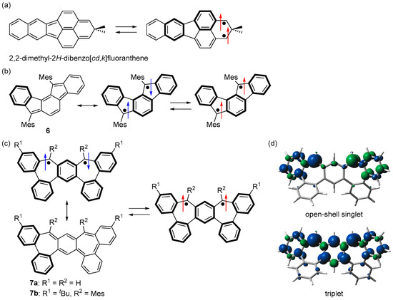 In contrast to the many studies of triplet non-Kekulé hydrocarbons, including Schlenk’s hydrocarbon and its derivatives, few triplet Kekulé hydrocarbons have been studied. 2,2-Dimethyl-2H-dibenzo[cd,k]fluoranthene was generated by McMasters et al. in cryogenic matrices, and its triplet ground state was experimentally confirmed (Figure 10a) [65]. An indeno[1,2-a]fluorene derivative 6 was reported by Haley et al. as a m-quinodimethane-based plausible triplet Kekulé hydrocarbon (Figure 10b) [66]. Although the triplet ESR signal of 6 was successfully observed (|D| = 0.021 cm−1), 6 has not been isolated, and its ground state has not been fully elucidated.