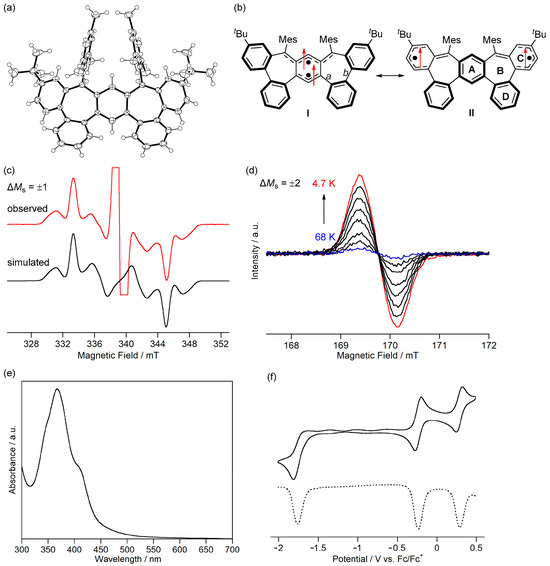 The fundamental optical and electrochemical properties of 7b were elucidated by measuring UV-Vis absorption spectra and cyclic voltammograms. 7b exhibited weak absorption bands below 600 nm in CH2Cl2, assigned to the transition from α-HOMO to α-LUMO of the triplet state (523 nm, TD-B3LYP/6-311G(d,p)//B3LYP/6-311G(d,p)) (Figure 11e). In addition, 7b did not show the NIR absorption expected for the open-shell singlet state (956 nm). Therefore, the population of thermally excited singlet states of 7b at room temperature is negligible, as expected from the calculated ΔEST (+26.3 kJ mol−1, UB3LYP/6-311G(d,p)). 7b was unstable in air; when the solution was exposed to air, the absorption of 7b disappeared within 15 min. The cyclic voltammogram of 7b showed reversible oxidation waves to radical cation at −0.24 V and to dication at +0.29 V vs. Fc/Fc+ and an irreversible reduction wave to radical anion at −1.82 V (peak potential) (Figure 11f). The small difference between the oxidation potentials would be due to the small energy difference between the α-HOMO (−4.47 eV) and α-HOMO−1 (−4.66 eV). 7b is the first triplet Kekulé hydrocarbon isolated. The difference in the electronic structures and properties of triplet non-Kekulé hydrocarbons between triplet Kekulé hydrocarbons will be elucidated.