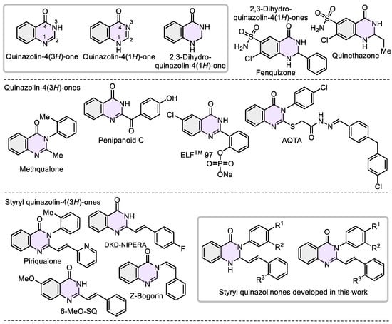 - Alsibaee, A.M.; Al-Yousef, H.M.; Al-Salem, H.S. Quinazolinones, the winning horse in drug discovery. Molecules 2023, 28, 978. [Google Scholar] [CrossRef]