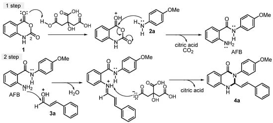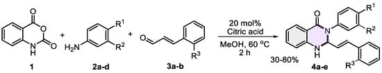 - Fahimi, N.; Sardarian, A.R. Citric acid: A green bioorganic catalyst for one-pot three-component synthesis of 2,3-dihydroquinazoline-4 (1H)-ones. Curr. Organocatal. 2016, 3, 39–44. [Google Scholar] [CrossRef]