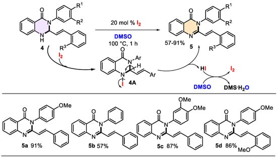 - Wen, S.; Du, Y.; Liu, Y.; Cui, X.; Liu, Q.; Zhou, H. Access to 2-Arylquinazolin-4(3H)-ones through Intramolecular Oxidative C (sp3)− H/N− H Cross-Coupling Mediated by I2/DMSO. Eur. J. Org. Chem. 2022, 2022, e202101187. [Google Scholar] [CrossRef]