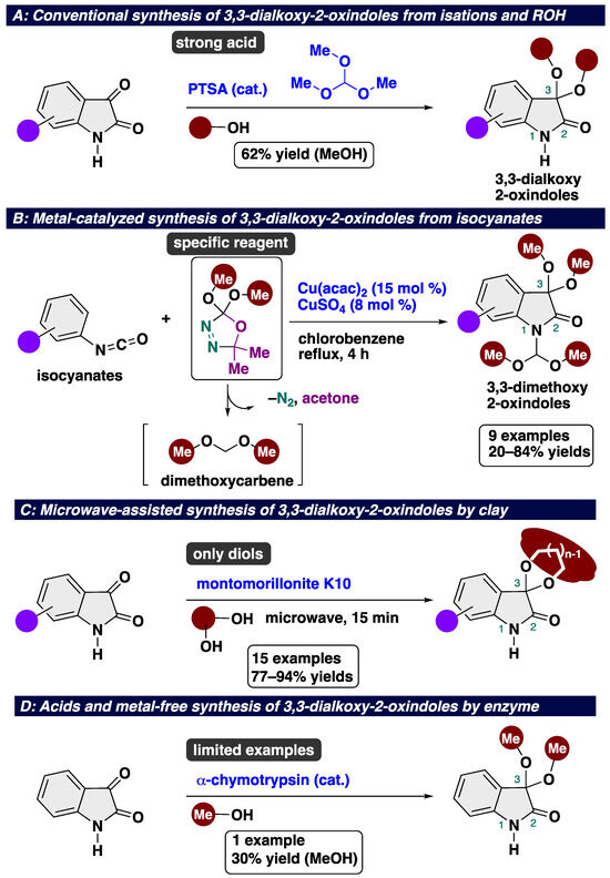 State-of-the-art in synthesis of 3,3-dialkoxy-2-oxindoles: (A) conventional synthesis of 3,3-dialkoxy-2-oxindoles using strong acid and ROH; (B) metal-catalyzed synthesis of 3,3-dimethoxy-2-oxindoles using a dimethoxycarbene equivalent; (C) microwave-assisted synthesis of isatin ketals in the presence of Montrmorlillonite K10; (D) acids and metal-free synthesis of 3,3-dimethoxy-2-oxindole.