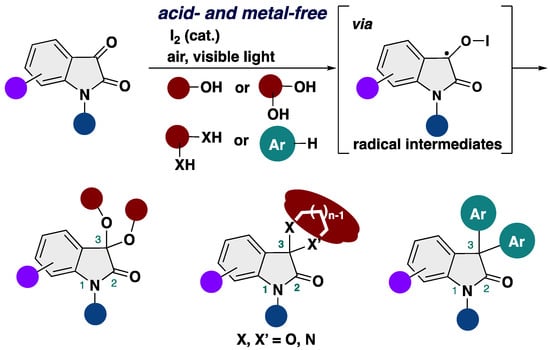 As part of our investigations into the synthesis of alkoxyindoles such as 2-alkoxyindoles [43,44,45,46], 3-alkoxyindoles [47,48,49], 2,3-dialkoxyindolines [50], and 1-alkoxyindoles [51], we were aware of the fact that a catalytic amount of molecular iodine can activate the methoxy group, producing a ketone moiety from 2,3-dialkoxyindolines [52]. Inspired by this interaction between molecular iodine and the methoxy group, we envisage that the use of iodine reagents as a Lewis acid catalyst or halogen bonding catalyst would facilitate ketalization between isatins and alcohols to afford 3,3-dialkoxy-2-oxindoles. Herein, we report on the efficient synthesis of 3,3-dialkoxy-2-oxindoles starting from isatins and alcohol through a mild ketalization by molecular iodine (Scheme 2). Our transformation paves the way for a diverse array of not only 3,3-dialkoxy-2-oxindoles but also 3,3-diaryl-2-oxindoles under metal- and acid-free conditions.