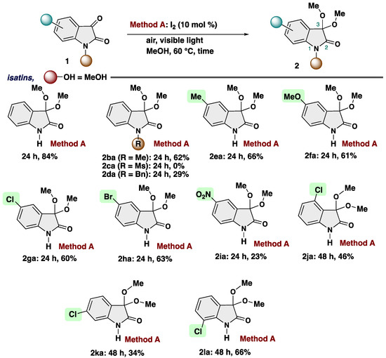 The sensitivity of the transformations to key parameters such as concentration, water level, oxygen level, light intensity, and scale is crucial for increasing the uptake of new reactions and their reproducibility [53]. Following this guideline, we investigated effects of H2O levels. To our surprise, the reaction using MgSO4 or Na2SO4 as a dehydrating reagent resulted in a slightly decreased yields (63% and 75% yields, respectively, runs 12 and 13). The CaCl2-tube as a H2O-scavenger did not affect the reaction outcome (run 14). These results indicates that our protocol does not require special caution about H2O to promote the reaction with good reproducibility. Aerial oxidation against I2 catalyst was observed, as the reaction under argon atmosphere (inert atmosphere) led to decrease the product yield (runs 15 and 16), which is evidence of the crucial role of atmospheric oxygen in the open flask. Then, the influence of visible light was investigated. The control reaction was performed under dark (in the absence of light) using flask covered by aluminum-foil, a decreased yield of 2aa was observed (run 17). Combination of dark and inert conditions interrupted transformation to afford a desired product in a decreased yield (run 18). This highlights the necessity of light for our transformation to take place. Next, the reaction temperature was investigated. When the reaction temperature was decreased to rt, a decreased yield of 2aa was observed (run 20). No 2aa was isolated in the reaction at 0 °C (run 21). The 0.1 M (mol/L, molar concentration) or 0.5 M concentration of the reaction mixtures shows low conversion (runs 22 and 23). The ketalization was conducted in the absence of I2 catalyst, resulting in the unchanged starting material recovery (run 24). This suggests that an I2 catalyst proved indispensable for ensuring the success of the ketaization of isatin using MeOH. Therefore, we determined that the optimal reaction conditions were 10 mol % of I2-catalyzed ketalization in MeOH (0.2 M) under air and visible light for 24 h at 60 °C (Table 1, run 6).