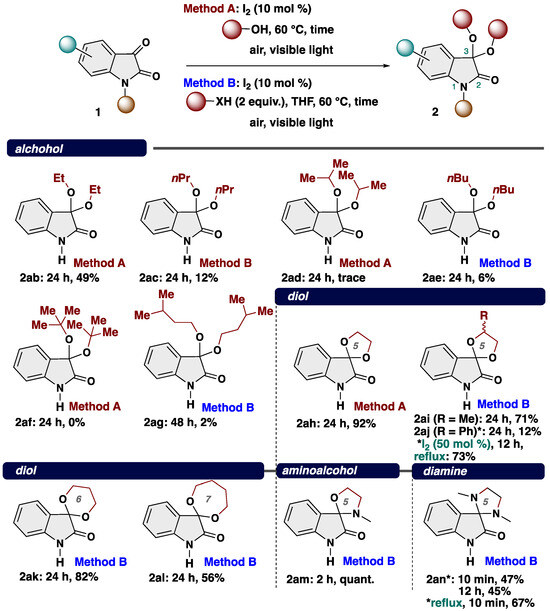 Next, to showcase the potentially broad applicability of our ketalization system, we explored the reaction scope with respect to nucleophiles such as alcohol, diol, aminoalcohol, and diamine (Scheme 4). Various alcohol including both linear and blanched alkyl alcohol were found to be suitable and gave the corresponding ketals 2ab (ethanol), 2ac (normal-propanol), 2ad (iso-propanol), 2ae (normal-butanol), and 2ag (isoamyl alcohol) in low yields. In the case of the reaction using sterically hindered tert-butanol, the desired reaction did not proceed at all (2af, 0%). To show the robustness of our protocol, we employed ethylene glycol as a dinucleophile, successfully delivering the spiroketal 2ah in 92% yield. We further explored the variation in the diol moiety, including 1,2-propanediol (2ai) and 1-phenyl-1,2-ethanediol (2aj), resulting in the production of the corresponding spiroketals as mixtures of diastereomers. Modified reaction conditions (50 mol % of I2, 2 equiv. of alcohol, reflux, 12 h) make the product yield improved (73% yield). The reaction was also amenable for 1,3-propanediol (2ak) and 1,4-butanediol (2al), which gave rise to the spiroketals bearing six-, and seven-membered rings (2ak: 82% yield; 2al: 56% yield). In addition to diols, aminoalcohol (2am) and diamine (2an) were amenable to undergo our transformation with low yields. 3,3-Diamino-2-oxindole is known as indole alkaloid isolated from a native orchid Cephalanceropsis gracilis [54].