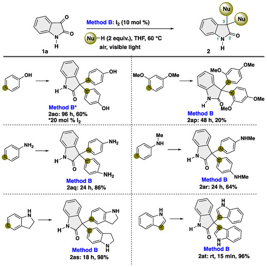 To further demonstrate the applicability of our protocol, we turned our attention to the reaction with heteroatom-substituted aryl compounds under modified conditions, which play an important synthetic intermediate for organic and medicinal chemistry [55,56,57,58,59,60] (Scheme 5). After intensive investigations, we found that a diverse array of heteroatoms-substituted aryl compounds proved to be suitable nucleophiles with isatin. The reaction with phenol proceeded smoothly, resulting in production of unexpected product 2ao in 60% yield, albeit using increased loading of I2 catalyst. The diacetate derivative of 2ao is known as a laxative [47]. Notably, the reaction proceeds at the para-position of the heteroatom-substituted aromatic rings. When the reaction was performed with 1,3-dimethoxybenzene, para-substituted product 2ap was obtained in 20% yield. In the case of aniline derivatives, the substituent at the nitrogen atom affected the efficiency of the desired transformation. Notably, aniline demonstrated efficacy as nucleophiles, yielding para-disubstituted product 2aq in 86% yield. Meanwhile, N-methylaniline showed a slight drop yield (2ar, 64% yield). Indole participated into our transformation to give 3-substituted product 2at in quantitative yield, which are known as indole alkaloid trisindoline [61,62,63], while the reaction with indoline afforded 5-substituted product 2as.