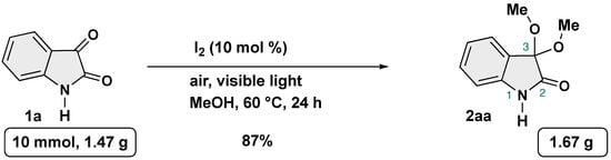Molecular iodine (I2) has attracted much attention from organic chemists due to its green, easily available, inexpensive, non-toxic, and highly reactive properties and user-friendly nature [33,34,35,36,37,38,39,40,41,42]. It is worth noting that the iodine-catalyzed reaction system does not require transition metals, making it attractive in sustainable green chemistry. Molecular iodine is tolerant against H2O, with easier-to-handle Lewis acid catalysts, while Lewis acids are usually deactivated by H2O. Thus, it is considered to be an efficient altanative to transition metal or Lewis or Brønsted acid catalysts. However, to the best of our knowledge, there are no reports of the ketalization of isatins using a catalytic amout of molecular iodine.