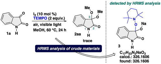 Based on the above experiments and previous reports [64,65,66,67,68], a plausible mechanism has been proposed (Scheme 8). First, the iodine radical is generated from molecular iodine by O2 and/or light [65]. Then, the carbonyl moiety of isatin (1a) was trapped by the iodine radical, yielding 3-isatin monoradical intermediate 4. This hypothesis was confirmed by a detection of TEMPO-adduct 3 derived from in situ generated monoradical species. At the same time, the iodine radical undergoes hydrogen abstraction from MeOH to give a methoxy radical (MeO•). The combination of MeO• and 4 afford 3,3-oxifunctionalized 2-oxindole 5. Finally, elimination of IO− affords oxonium intermediate 6, which further undergoes addition by MeO− to afford the final product 2aa. The catalyst I2 can be reproduced from the resultant HI and/or IOH [68]. However, the detail in the reaction mechanism is unclear at this stage.