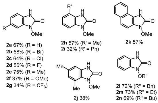- Wang, Q.; An, J.; Alper, H.; Xiao, W.-J.; Beauchemin, A.M. Catalytic substitution/cyclization sequences of O-substituted Isocyanates: Synthesis of 1-alkoxybenzimidazolones and 1-alkoxy-3,4-dihydroquinazolin-2(1H)-ones. Chem. Commun. 2017, 53, 13055–13058. [Google Scholar] [CrossRef]