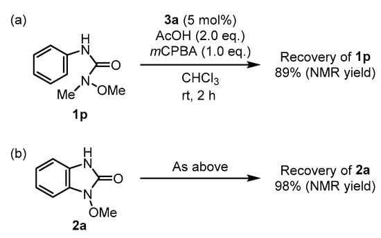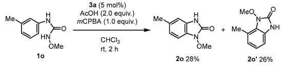 The catalyst precursor 3a (6.1 mg, 0.015 mmol, 5 mol%) and acetic acid (34 µL, 0.60 mmol, 2.0 equiv.) were added to a chloroform solution (1.5 mL) containing urea 1 (0.30 mmol). Subsequently, wet mCPBA (74.0 mg, 70% purity contains ca. 30% water, 0.30 mmol, 1.0 equiv.) was added, and the mixture was stirred at room temperature for 2 h. Following completion of the reaction, ethyl acetate was added to the reaction solution, and the organic layer was washed with baking soda, a sodium thiosulfate solution, and saturated brine before drying over anhydrous sodium sulfate. The solution was filtered and concentrated under reduced pressure and purified by column chromatography to obtain the corresponding benzimidazolinone 2.