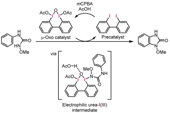 The proposed catalytic cycle is illustrated in Scheme 6. In the presence of mCPBA and AcOH, the iodine(I) precatalyst may undergo oxidation to form the reactive μ-oxo iodine(III) catalyst. Subsequently, ligand exchange can occur to replace the OAc ligand with the substrate, possibly yielding an electrophilic urea-I(III) intermediate, where the N-methoxy amide nitrogen of the substrate coordinates to iodine. According to DFT calculations by Houk and Xue, a dearomatizing spirolactonization reaction is facilitated by proton transfer from a carboxylic-acid-type substrate to a bridged oxygen of a μ-oxo catalyst []. Inspired by this computational study, we speculated that the urea-I(III) intermediate undergoes protonation, as depicted in Scheme 6, to form a reactive intermediate that can rapidly provide benzimidazolinone through oxidation of the urea ligand.