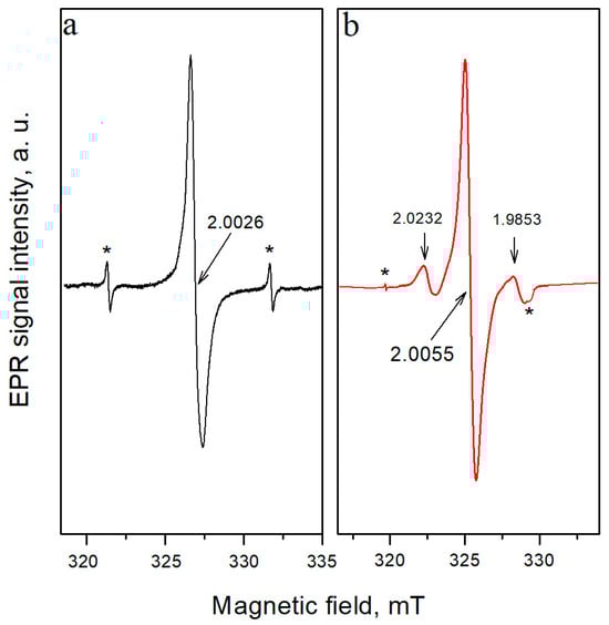 EPR spectra of walnuts: (a) before irradiation (The amplification used in order to record the EPR spectra of non-irradiated samples is 10 times higher than that for irradiated samples); (b) immediately after irradiation with 10 kGy; (*)—Mn signal.