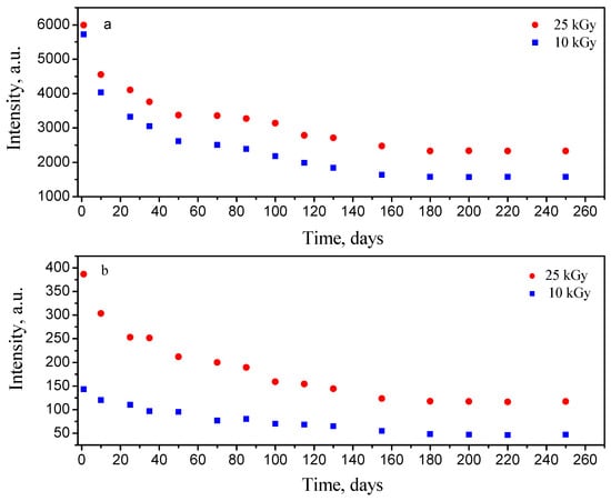 The time dependence of the EPR signal intensity of irradiated walnuts: (a) central line; (b) satellite lines.