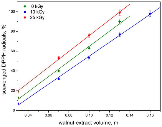 Dependence of scavenged DPPH radicals (%) on walnut extract volume (mL): non-irradiated (♦), irradiated by 10 kGy (▪), and irradiated by 25 kGy (●). Error bars = SD, n ≥ 3.