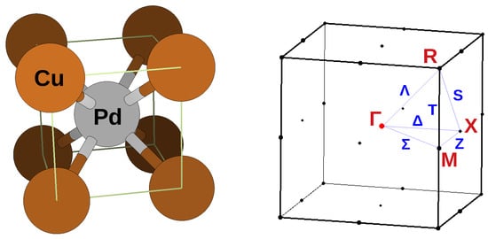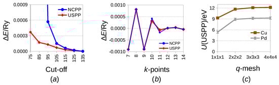 Alternative calculations were performed by replacing core electrons with norm-conserving pseudopotentials (NCPPs) from the PseudoDojo library [30]. The electronic configurations explicitly taken into account are for 29Cu and for 46Pd. Valence electron states were expanded in plane waves with a kinetic energy cutoff of 125 Ry, a charge density cutoff of 1000 Ry and a convergence threshold of Ry. The Hubbard U-parameters determined with a single-step calculation on a 2 × 2 × 2 grid are U(Cu-3d) = 10.7045 eV and U(Pd-4d) = 9.0743 eV. For structural optimization of the unit cell and calculation of the electronic bands, the first Brillouin zone was integrated with an MP mesh [28] of 12 × 12 × 12 points with a Marzari–Vanderbilt–DeVita–Payne [29] cold smearing parameter = 0.01 Ry. The results of the convergence tests are summarized in Figure 2.
