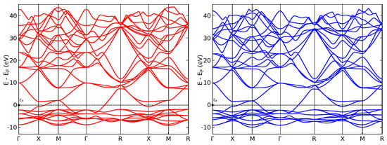The computed electronic dispersion bands are compared in Figure 3 where the energy of the Fermi level ( = 10.9547 eV and = 16.1461 eV) has been set to zero. The band structures are calculated along the path that contains the highest symmetry points in the first Brillouin zone, as shown in Figure 1.