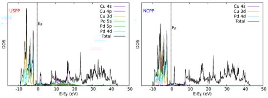 The electronic density of state curves calculated with USPP and NCPP and represented in Figure 4 are qualitatively similar. Both are characterized by a dense valence band between the and −10 eV and a conduction band above 8 eV separated by a low-density region. In order to assess the contribution of the atomic orbitals of Cu and Pd within the electronic band structure, projected density of state curves were calculated and reported in Figure 4 as colored traces. Before analyzing the obtained results, it is important to take into account that Quantum ESPRESSO calculates wavefunction projections only over the atomic orbitals which are explicitly described by the pseudopotential. For this reason, the projections obtained with NCPP and USPP, which account for different atomic orbitals, are qualitatively different The atomic orbital contributions of the valence bands and the first conduction band at the -point are listed in Table 2. USPP results suggest that the main contribution to the valence band is associated with Cu-3d and Pd-4d orbitals, whereas the Cu-4s, Cu-4p, Pd-5s and Pd-5p ones explain the conduction band peaks at low energy. The lower energy signals mostly originate from the Cu-3d orbitals, while the higher energy ones are mainly traced back to Pd-4d. However, also, the Cu-4s, Cu-4p, Pd-5s and Pd-5p orbitals have a not negligible contribution. In particular, they are responsible for the peak at −0.65 eV. Similarly, it is worth noticing that Pd-4d orbitals significantly contribute to the feature in the 1.3–2.3 eV conduction region. Comparison with Figure 5b of Jain et al. [33] concerning FP-LAPW/PBE-GGA calculations suggests that the color code for Pd-d and Pd-p could be reversed.