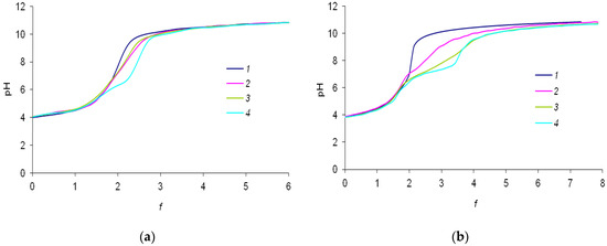 (a) Experimental curves of titration for the solutions containing (1)—0.150 mM H2(1,4-bdc), (2)—0.150 mM H2(1,4-bdc) and La(NO3)3, (3)—0.150 mM H2(1,4-bdc) and Eu(NO3)3, and (4)—0.150 mM H2(1,4-bdc) and Lu(NO3)3 with 10 mM NaOH solution with (a) 1:8 metal-to-ligand ratios and (b) 1:2 metal-to-ligand ratios. All solutions contained 0.01 M KNO3 background electrolyte.