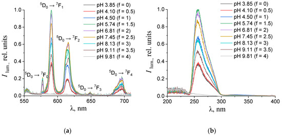 The initial data were experimentally obtained as dependencies of the pH of the solutions on the degree of titration f, i.e., on the number of added equivalents of the alkali per proton of terephthalic acid (Figure 3a,b). The titration curves of the mixtures of terephthalic acid with lanthanide’s nitrate are similar to titration curves of terephthalic acid solutions in the range of f < 1. In the range of 1 < f < 2, slight differences due to complexation process are observed. The curves of Ln3+-H2(1,4-bdc) mixtures differ from curves of H2(1,4-bdc) most significantly when terephthalic acid is quite neutralized, which corresponds to f > 2. While the titration curves of the terephthalic acid have only one equivalence point corresponding to its complete neutralization, titration curves of the mixtures of terephthalic acid with lanthanide ions exhibit an additional equivalence point at a titration degree of ~2.2–2.5 for 1:8 systems and ~2.5–3.5 for 1:2 systems. The second equivalence point refers to the formation of hydroxo complexes of lanthanide ions with general formula Ln(OH)y3−y or hetero-ligand complexes with the general formula Lnx(OH)y(1,4-bdc)z. For solutions containing La3+, Eu3+, and Lu3+ cations, an increasing shift in the second equivalence point to the alkaline region is observed. This indicates that the number of coordinated OH−-groups and the stability of complexes containing OH–-groups are increasing. For further analysis of the complex formation characteristics, a computation with special software is required. In order to determine the nature of the second equivalence point in the titration curves, we studied the luminescent properties of solutions.