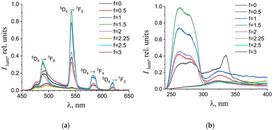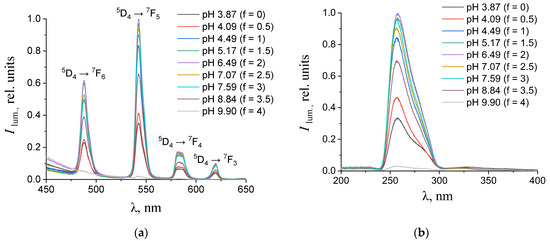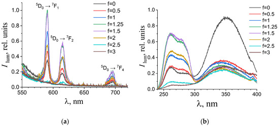 As one can see from Figure 4, Figure 5, Figure 6 and Figure 7b, the most intense luminescence of europium(III) and terbium(III) ions corresponds to the excitation wavelength of 260–280 nm. The emission spectra—Figure 5, Figure 6, Figure 7 and Figure 8a—contain the bands corresponding to the 5D0 → 7FJ (J = 0–4) f-f transitions of Eu3+ ion: 5D0 → 7F0 (578 nm), 5D0 → 7F1 (590 nm), 5D0 → 7F2 (610–615 nm), 5D0 → 7F3 (650 nm) and 5D0 → 7F4 (685–705 nm) [40] and the bands corresponding to the 5D4 → 7FJ (J = 6–3) f-f transitions of Tb3+ ion: 5D4 → 7F6 (489 nm), 5D4 → 7F5 (543 nm), 5D4 → 7F4 (584 nm), and 5D4 → 7F3 (619 nm) [42]. The “antenna” sensitizing mechanism of europium(III) and terbium(III) luminescence is observed for solutions with the 1:2 metal-to-ligand ratio in the range of 0 < f < 3.5 and for solutions with the 1:8 metal-to-ligand ratio in the range of 0 < f < 2. This is evidenced, firstly, by the fact that the characteristic appearance of the luminescence spectrum of europium(III) and terbium(III) ions is observed when solutions are excited into the ππ * state of the terephthalate ligand. Secondly, the excitation spectra contain wide bands that correspond to the absorption of terephthalate ions. In the case of photoluminescence as a result of direct f-f excitation of lanthanide ions, the excitation spectra would contain much more narrow bands, which corresponds to the f-f absorption of europium(III) or terbium(III) ions.