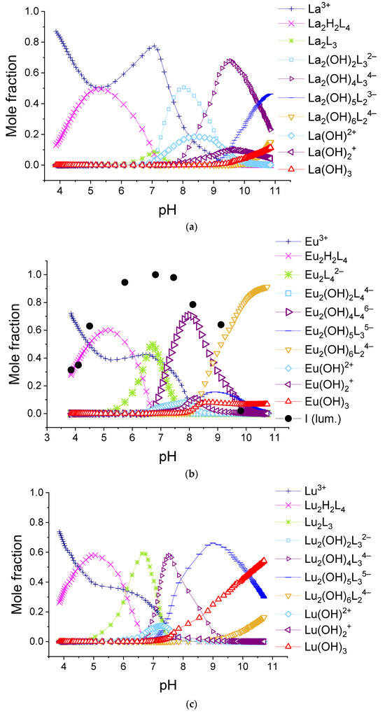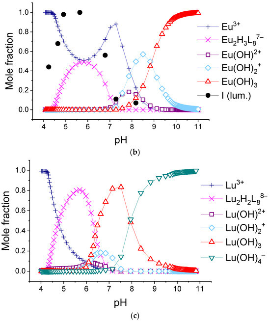 The calculated molar fractions of components for system consisting of 0.155 mM H2(1,4-bdc) and 0.0194 mM: (a)—La3+, (b)—Eu3+, and (c)—Lu3+. L = 1,4-bdc2−.