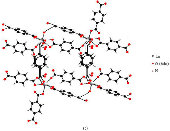 Available structures of the terephtalate complexes of lanthanide ions formed in solution with 1:8 metal-to-ligand ratio (a), (b)—the dimers with some features of Ln2(1,4-bdc)3(H2O)4 solid-state structure, and (c)—the tetramer with some features of Ln2(1,4-bdc)3(H2O)8·2H2O solid-state structure.