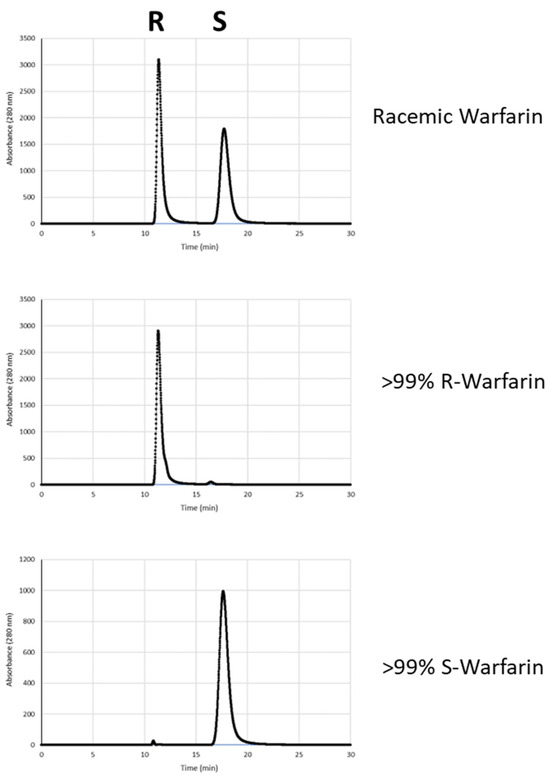 Finally, to further enhance the enantiopurity of the mixtures of (R)- and (S)-warfarin obtained from d- and L-Arg-catalyzed reactions, we sought to enrich these enantiomers by recrystallization. However, we found that simple acetone–water recrystallization was an unreliable method for enantiomeric enrichment. Instead, following flash column isolation of warfarin (hexanes/ethyl acetate) and the removal of solvent via rotary evaporation, the resulting yellowish oil was placed under hexanes and allowed to sit for at least 48 h under reduced pressure. During this interval, the hexane layer evaporated and warfarin began to crystallize. Under these conditions, warfarin crystallizes in a roughly 1:1 ratio of R:S warfarin, leaving behind a portion of the product as an enantiomerically enriched yellow liquid. This enriched yellow liquid was then separated from the crystals by pipette (crystals can also be removed by centrifugation and pipetting away the yellow liquid) and recrystallized using 80% acetone/20% water, yielding highly enriched warfarin (Figure 3 and Figure 4). For example, from scaled up (7X) L- or d-Arg-catalyzed reactions, we obtained 132 mg of (R)-Warfarin (12% overall yield) and 173 mg of (S)-Warfarin (16% overall yield), both in >99% ee. These overall yields are in line with those obtained from the resolution of warfarin enantiomers with quinidine–diastereomer approaches, with fewer recrystallization steps [6].