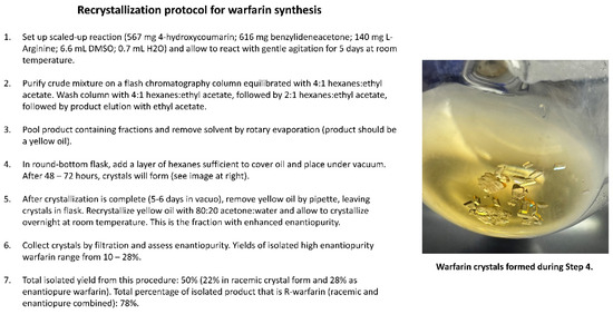 Example recrystallization protocol for the isolation of enantiopure warfarin from enantiomerically enriched organocatalytic preparations.
