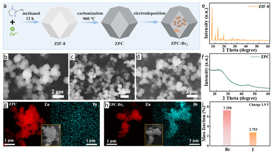 The ZIF-8-derived porous carbon (ZPC), serving as the host material of Br2, was synthesized successfully by pyrolysis of ZIF-8 at 900 °C under an argon atmosphere (denoted as ZPC in the following text), as illustrated in Figure 1a. SEM was conducted to analyze the morphology of the samples. As shown in Figure 1b, the typical rhombic dodecahedron structure of ZIF-8 is clearly observed, which is in accord with previous reports [22,23]. In Figure 1c, the morphology and structure are well preserved after calcination. Subsequently, ZPC was utilized as the electrode for the electrodeposition of Br2 to obtain ZPC-Br2. No alterations in the structure were observed after electrodeposition (Figure 1d), indicating that the ZPC exhibited favorable structural stability and efficient Br2 fixation. It is highly important for the long-life cycling performance of zinc-bromine batteries [24,25]. The crystal structure of the ZIF-8 was examined by XRD, as depicted in Figure 1e, and all the diffraction peaks can be attributed to the ZIF-8 (JCPDS 96-711-1974). Two weak crystallization diffraction peaks at about 24.0° and 44.0° are attributed to the low degree of graphitization of ZPC (Figure 1f). The images of EDS mapping also demonstrate that the bromine element effectively deposits onto the ZPC-Br2 electrode compared with the ZPC electrode, as shown in Figure 1g,h. Additionally, the results of ICP-MS indicate that the content of the Br-species in the ZPC-Br2 electrode is 7.258 wt.%, and the corresponding mass-loading is 1.441 mg cm−2. The iodine-species content of the ZPC-Br2 electrode is 2.753 wt.%, and the corresponding mass-loading is 0.544 mg cm−2. These results further demonstrate the existence of iodine species and Br species in the ZPC-Br2 electrode (Figure 1i).