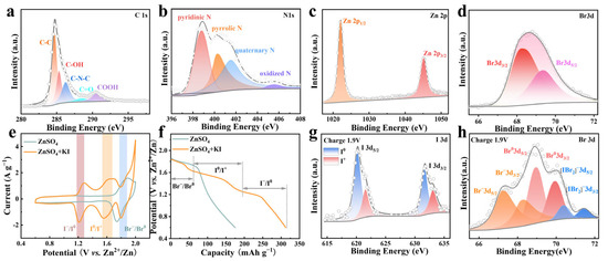 (a) C 1s XPS spectra of the ZPC-Br2 cathode. (b) N 1s XPS spectra of the ZPC-Br2 cathode. (c) Zn 2p XPS spectra of the ZPC-Br2 cathode. (d) Br 3d XPS spectra of the ZPC-Br2 cathode. (e) CV curves of ZPC-Br2||Zn battery in ZnSO4 and ZnSO4 + KI electrolytes at 1 mV s−1. (f) The GCD curves at 2 A g−1 of ZPC-Br2||Zn battery in ZnSO4 and ZnSO4 + KI electrolytes. (g) I 3d XPS spectra of the ZPC-Br2 cathode at charge stage. (h) Br 3d XPS spectra of the ZPC-Br2 electrode at charge stage.