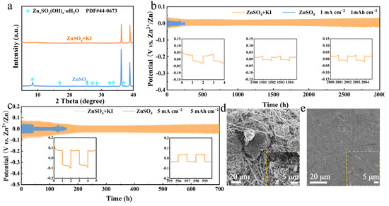 (a) XRD patterns of Zn anode after 20 cycles in different electrolytes. (b) Cycling performance at 1 mA cm−2, 1 mAh cm−2. (c) Cycling performance at 5 mA cm−2, 5 mAh cm−2. (d) SEM image of Zn anode after 20 cycles in ZnSO4 electrolyte at 5 mA cm−2, 1 mAh cm−2. (e) SEM image of Zn anode after 20 cycles in ZnSO4 + KI electrolyte at 5 mA cm−2, 1 mAh cm−2.