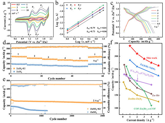 The effects of I− additive on the electrochemical performance of zinc-bromine batteries were further evaluated. The CV curves of the ZPC-Br2||Zn battery in ZnSO4 + KI electrolyte at different scan rates display three pairs of reversible redox peaks at 1.2/1.3 V, 1.6/1.7 V, and 1.8/1.9 V (vs. Zn/Zn2+), which correspond to the I−/I0, I+/I0, and Br−/Br0 redox reactions, respectively (Figure 4a). Moreover, the shapes of the CV curves at different scan rates exhibit favorable symmetry. The slight shifts of the oxidation peaks in the positive direction and reduction peaks in the negative direction at high scan rates indicate the fast reaction kinetics. The plots of redox peak currents (ip) versus scan rates (ν) based on the CV curves are used to calculate the b values of the ZPC-Br2||Zn battery. The b values are fitted to be 0.79/0.81 (P1/P1*) and 0.73/0.86 (P2/P2*), manifesting that these redox reactions are a combination of diffusion-controlled and capacitance-controlled behavior (Figure 4b) [42,43]. Furthermore, the GCD results in Figure 4c further demonstrate this, where the pairs of charging/discharging voltage plateaus at 1.2/1.3 V, 1.6/1.7 V, and 1.8/1.9 V (vs. Zn/Zn2+) align well with the results for the CV curves. Even at a high current density of 5 A g−1, the voltage plateau is well maintained with a much lower voltage drop, indicating the fast reaction kinetics.