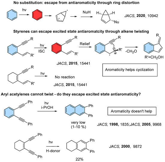 We will begin with a short preface discussing the role of aromaticity in the photochemical reactions of aromatics substituted with double and triple bonds. Benzene, the prototypical aromatic molecules in its ground state, exhibits strong antiaromaticity in the S1 and T1 states. This reversal of electronic properties was derived qualitatively for the lowest triplet state (T1) by Baird [8,15], and later extended to the lowest singlet excited state (S1) of benzene through quantum chemical computations [16,17,18,19,20].