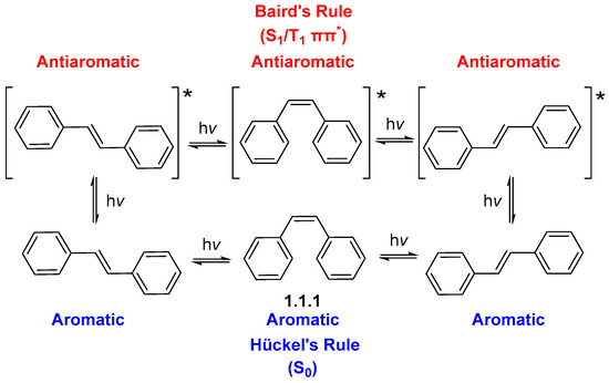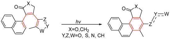 As mentioned above, arenes can be converted from aromatic to antiaromatic in photochemical reactions; for example, benzene becomes antiaromatic and highly reactive in the lowest ππ* excited states (Scheme 2). The reversal of the Hückel rules in excited states is known as Baird’s rules [8,9,34,35], a key concept that facilitates the analysis of the photocyclization of aromatic compounds.