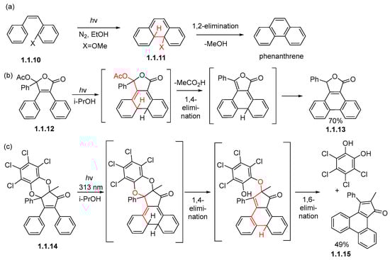 In the absence of oxidants, the initial cyclization products may also be trapped by elimination if a suitably placed leaving group is present. For example, o-OMe-stilbenes 1.1.10 give exclusively phenanthrenes 1.1.11 in N2 atmosphere via the loss of MeOH (Scheme 7a) [52]. These leaving groups do not necessarily need to be placed in the ortho position of the stilbene, allowing creativity to play a role in the synthesis of new molecules. As such, the conversion of acetoxy lactone 1.1.12 to aromatized cyclic product 1.1.13 involves the 1,4-elimination of acetic acid followed by tautomerization (Scheme 7b) [53]. Another creative use of unusually placed leaving groups is shown in the non-oxidative conversion of stilbene 1.1.14 to phenanthrene 1.1.15, where 1,4-elimination is followed by 1,6-elimination and tetrachlorocatechol serves as a leaving group twice (Scheme 7c) [54,55].
