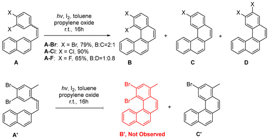 The effects of meta- and para-halogen-substituted stilbene derivatives were also studied, giving unique results. Avarvari et al. discovered that the photocyclization of 3,4-dihalo-styrylnaphthalenes has different selectivity depending on which halogens are present [56]. The Mallory-type photocyclization of A–Br yields products B–Br and C–Br in a 2:1 ratio (Scheme 8). In this instance, the usual Mallory mechanism, where aromatization is achieved by oxidation via with I2, is still favored. However, the observed formation of product C–Br indicates that aromatization via the release of HBr is possible. On the other hand, the cyclization of A–Cl yields the formation of three products, one of which (D–Cl) did not have an analog in the reaction of the brominated stilbene A–Br. Due to the complexity of the NMR and similar polarities, it was difficult to determine the product ratios for this reaction. Surprisingly, the photocyclization of A–F leads to the formation of B–F and D–F in a ratio of 1:0.8. Based on these results, while the brominated stilbenes give preference to a loss of two hydrogen atoms instead of HBr, when X=F, the formation of HF is much more unfavorable and only di-fluorinated products are formed as a result of A–F photocyclization. Another interesting result was derived when one of the possible photocyclization directions was blocked by an ortho Me group. Such modified substrate A’ provided a single cyclized product C’ with the concomitant loss of HBr (Scheme 8).