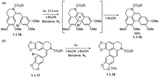 A base can also be used to facilitate the trapping of substituted dihydrophenanthrene (DHP) intermediates, as illustrated by the conversions of 1.1.16 (Scheme 9a) and 1.1.17 (Scheme 9b) into 1.1.18 and 1.1.19, respectively [57]. When bromine is placed in the ortho position of the stilbene bridge, the reaction starts via electrocyclization, and continues by the elimination of the bromine leaving group, resulting in aromatization. This shows an important difference in reactivity as a function of having different halogens as leaving groups. In the next section, the reactivity of o-iodostilbenes will be shown to be initiated by the homolytic cleavage of the C–I bond, giving rise to an aryl radical which adds into the opposing benzene ring. This reactivity contrasts the reaction of their bromo analogs, which proceed via the electrocyclization of the stilbene moiety into dihydrophenanthrene followed by the elimination of the halogen leaving group. It is worth noting that the reactivity of Cl-substituted substrates is similar to that of the shown Br-substituted compounds, as seen in the work of Morin et al. [58].