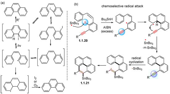 We have mentioned previously that iodo-substituted phenanthrenes can form phenanthrenes by the loss of iodine. It was suggested that the C–I bonds are cleaved photolytically, leading to an intramolecular free-radical arylation (Scheme 10a). Such arylations are known in ground state radical reactions where they can indeed serve for the preparation of phenanthrenes [59,60]. Furthermore, the selective activation of the Ar–I bond in the presence of an alkyne can be useful for the initiation of more extended cascades, as illustrated by the transformation of enyne 1.1.20 into pyrene 1.1.21 (Scheme 10b). A photochemical version of this process would provide a green alternative to such transformations.