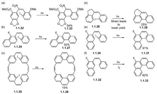 Additional examples include the transformation of nitrostilbene 1.1.22 to its corresponding phenanthrene 1.1.23 (Scheme 11a) [61], which does not occur through electrocyclization. This puzzling behavior has been well recorded in multiple nitro stilbene derivatives [38,61]. Additionally, attempts to cyclize the 3- and 4-iodo-substituted nitrostilbenes did not afford any phenanthrene products. Non-oxidative conversions of o-iodo stilbenes 1.1.24, 1.1.25, and 1.1.26 to phenanthrenes 1.1.27 [62], 1.1.28 [63], and 1.1.29 [64] (Scheme 11b–d) are also possible. The same transformations fail under oxidative conditions. Interestingly, the introduction of o-iodo substituents sometimes offers a better alternative to oxidative cyclizations, as shown in the comparable transformations of 1.1.30 and 1.1.31 to 1.1.32 and 1.1.33, respectively (Scheme 11e,f) [65].
