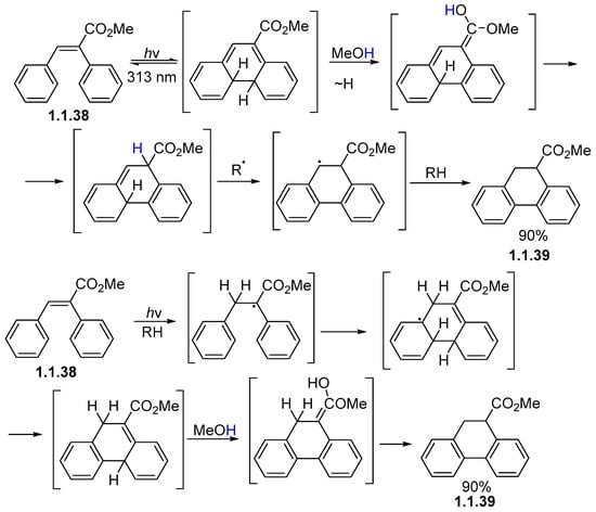 On the other hand, the conversion of methyl α-phenylcinnamate 1.1.38 to 9-carbomethoxy-9,10-dihydrophenanthrene 1.1.39 (Scheme 13) follows a different pathway where, after electrocyclization, the resulting intermediate undergoes proton exchange with MeOH, followed by a radical hydrogen abstraction–addition to give the final dihydrophenanthrene product [68]. It is unclear, however, what the source of radical species under anaerobic conditions is.