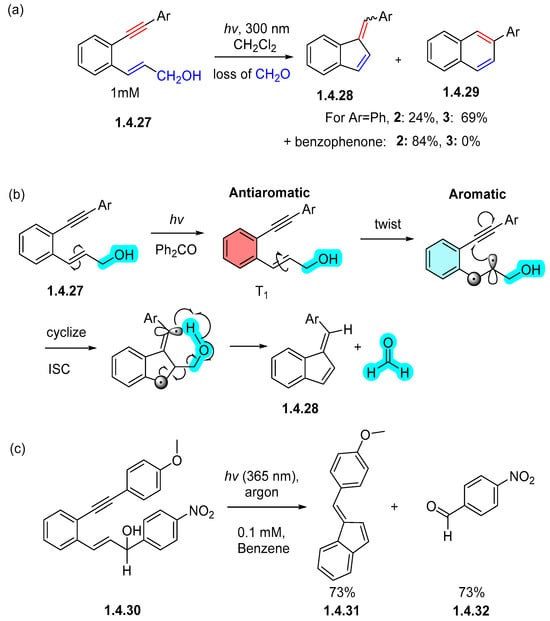 However, when an alkene is attached to benzene, alkene twisting relieves antiaromaticity and the arene ring remains intact [23,24,25,26]. The twisted alkene is a diradical and can react with a pendant functionality, for example, initiating the C1–C5 cycloaromatization of enynes (Scheme 1) [24].