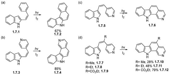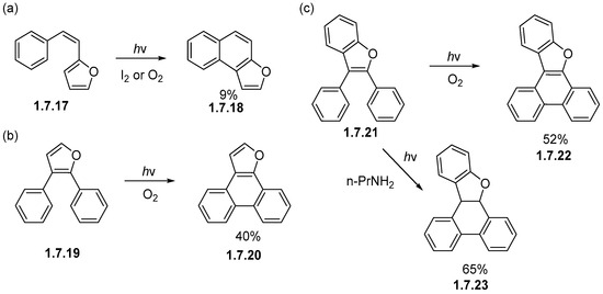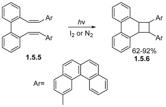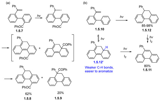 Stilbene derivatives containing additional rings may also undergo oxidative photocyclization when these rings do not impose structural constrains that would force the ortho carbon atoms too far apart from one another, causing the cyclization to lose in competition with the decay of the excited stilbene to the ground state. 1,2-diphenylcyclopentene 1.1.4 (Scheme 6a) is an example wherein the additional ring does not impose a sufficient strain penalty, thus forming 9,10-cyclopentenophenanthrene 1.1.5 in an 82% yield [38,50].