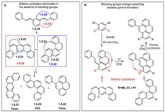 In photocyclizations that produce extended polyaromatic frameworks, steric constraints may overcome electronic preferences. One example is the competing formation of polyaromatic hydrocarbons (PAH) 1.2.1 and 1.2.2 from conformers 1.2.3 and 1.2.4 (Scheme 18b) [76]. The formation of 1.2.1 creates more steric hindrance between the aromatic rings, which forces distortion while the formation of 1.2.2 does not, leading to its formation in a 50% yield as the major product. However, when both pathways are sterically hindered, electronic preferences dominate, as exemplified by the formation of [8]helicene 1.2.5 from di-3-benzo[c]phenanthrylethylene 1.2.6 in 80–85% yields (Scheme 18a) [77,78].