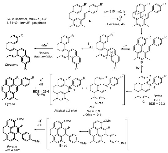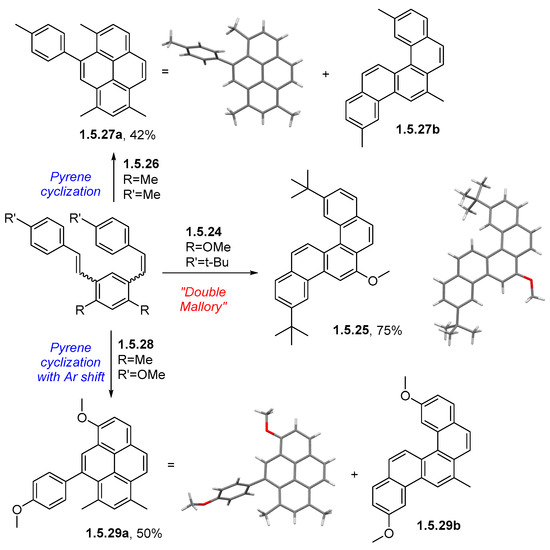 - Dos Santos, N.R.; Schober, J.V.; Laconsay, C.J.; Palazzo, A.M.; Kuhn, L.; Chu, A.; Hanks, B.; Hanson, K.; Wu, J.; Alabugin, I.V. Assembly of Pyrenes through a Quadruple Photochemical Cascade: Blocking Groups Allow Diversion from the Double Mallory Path to Photocyclization at the Bay Region. J. Am. Chem. Soc. 2025, 147, 1074–1091. [Google Scholar] [CrossRef]